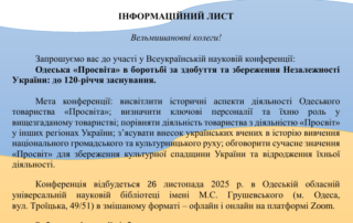 Вельмишановні колеги! Запрошуємо вас до участі у Всеукраїнській науковій конференції «Одеська «Просвіта» в боротьбі за здобуття та збереження Незалежності [...]